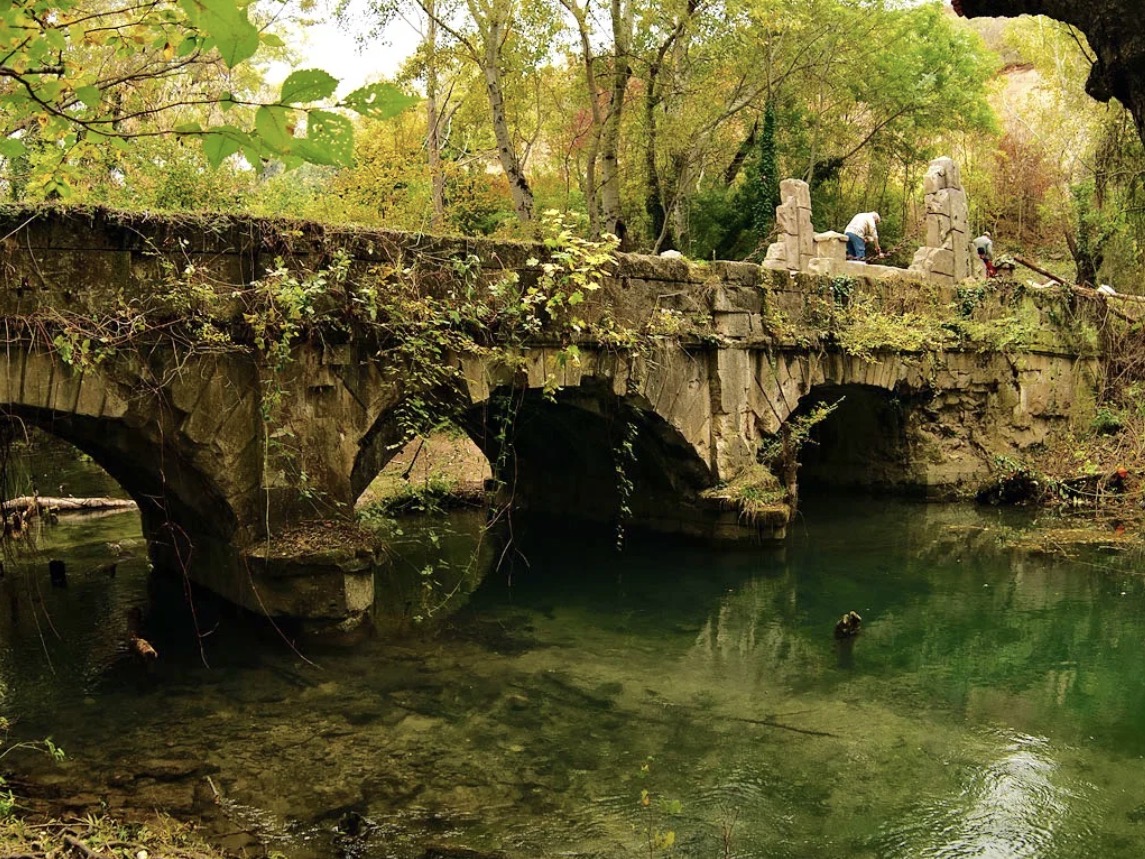 Осень (сентябрь–октябрь) — идеальное время. Золотая листва вьющихся растений на камнях акведука, жёлтые ивы над рекой, мягкий свет — картина почти нереальная. Весна (апрель–май) — второй по красоте период: цветущие берега реки и яркая зелень на белом камне. Летом красиво, но жарко и много комаров — приходите утром.